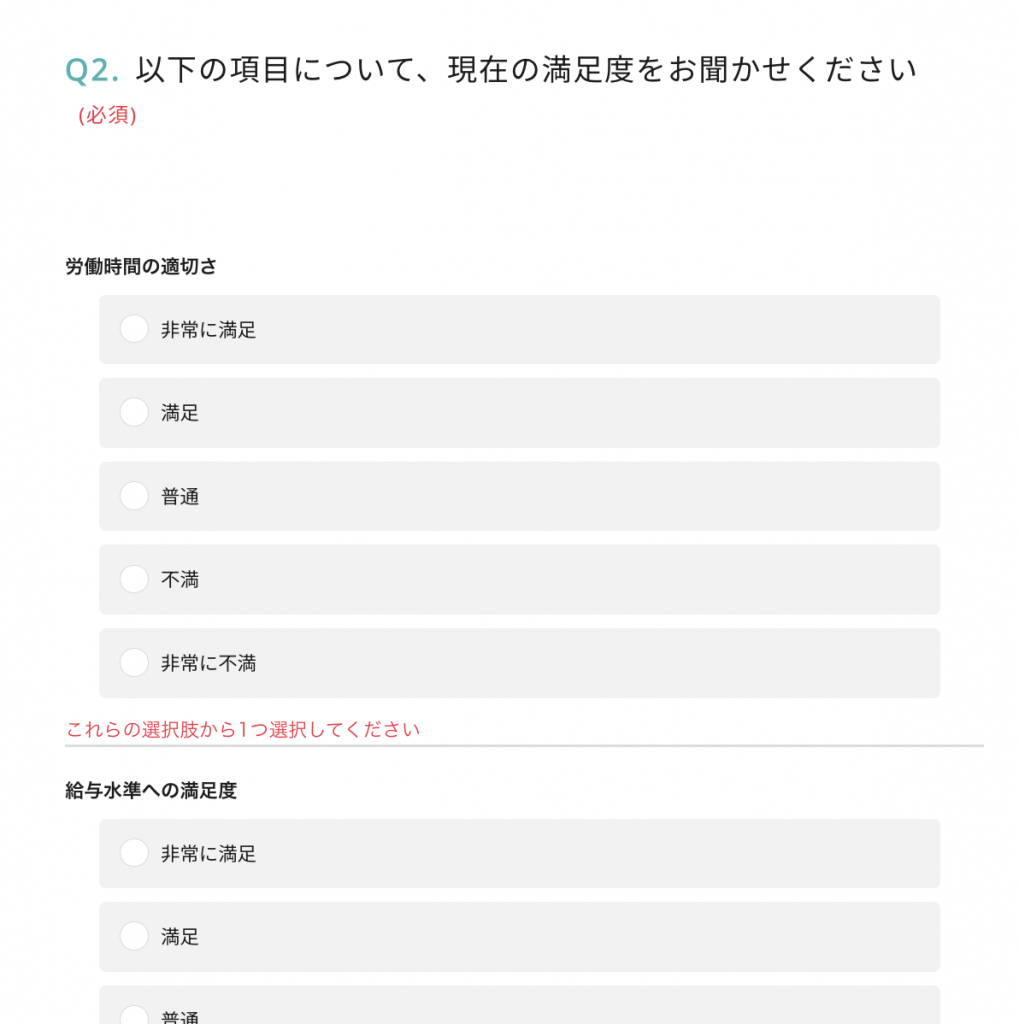 数値入力で回答された「1ヶ月あたりの残業時間」データは、労働基準法遵守の観点からも重要なデータとなりました。特に残業が集中する特定の支店や部門を特定できたため、より公平なシフト組みや人員配置の見直しの根拠データとして活用できています。