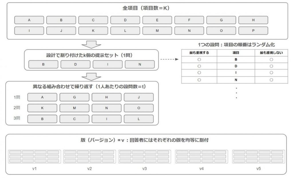 提示する k 個の組み合わせは“ランダム抽出”ではなく設計で事前に割り付けます(BIBD/近似BIBD:項目の組み合わせを統計的にバランス良く設計する手法)。ランダム化するのは回答者のアンケートフォーム画面内の表示順です。回答者は v 個の版に均等に割り付け、サンプル全体で 1-way/2-way/連結性/位置バランスが揃うようにします。