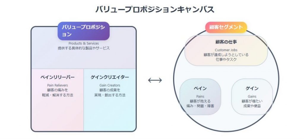 この設計を支援する有効なフレームワークが「バリュープロポジションキャンバス」です。顧客の視点(Jobs, Pains, Gains)と、提供側の視点(Products & Services, Pain Relievers, Gain Creators)を対応づけることで、両者のフィットを可視化し、顧客にとって真に意味のある価値提案を構造的に導き出すことができます。