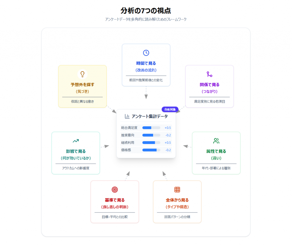 では、PQはどのように考えればよいでしょうか。ここで役に立つのが、「観察軸」という考え方です。同じ集計結果でも、「どのレンズで見るか」によって見えるものが変わります。本稿では、PQを立てる際のレンズとして、次の7つの観察軸を使います。