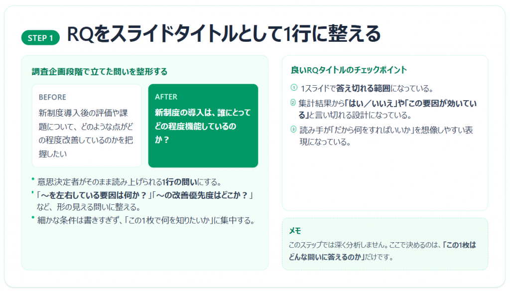 まず、調査企画時に定義したRQを改めて確認し、スライドタイトルとして置ける形に1行で書き直します。