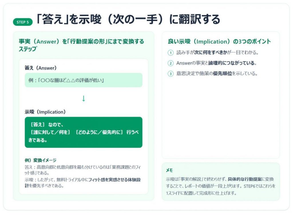 • ステップ6:「問い/答え/示唆」を1スライドに配置する