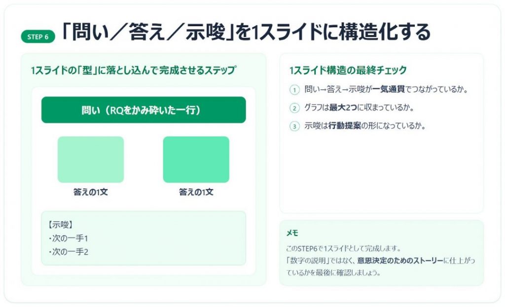 • 6ステップで「問い→答え→示唆」を1スライドに構造化する