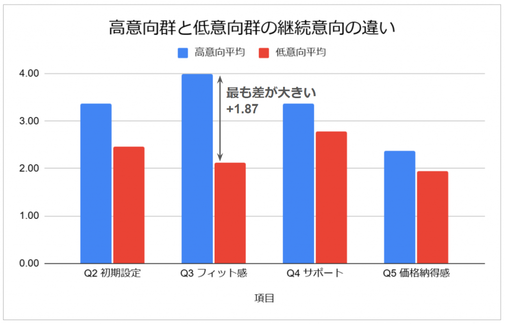 PQ1:継続意向が高いグループと低いグループで、Q2〜Q5にどんな差が出ているか?