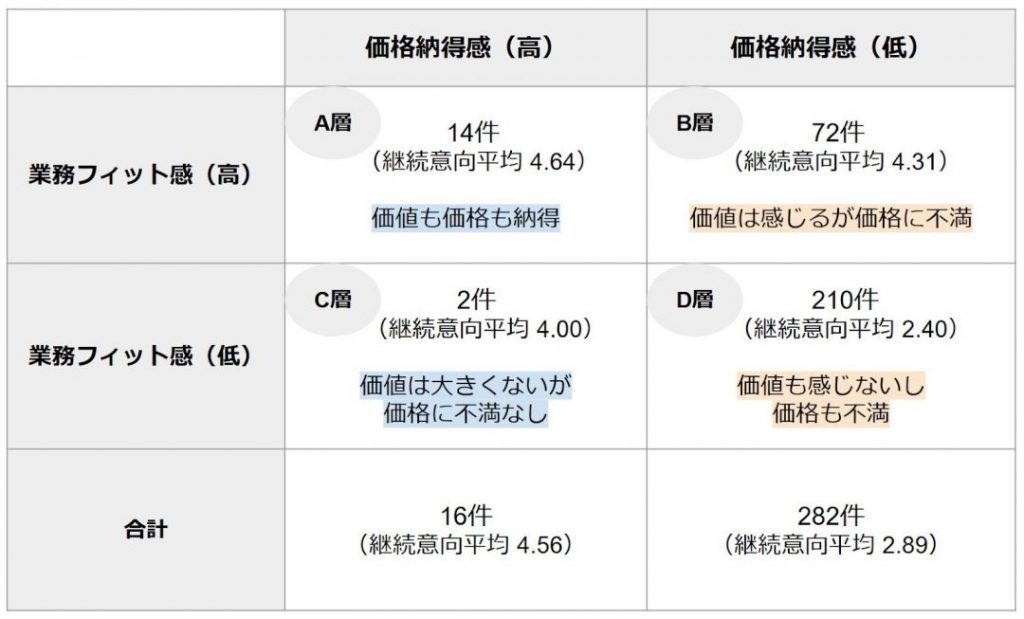 • しかし、業務フィット感さえ高ければ、価格に不満があっても継続意向は極めて高い(B層:平均4.31)。
