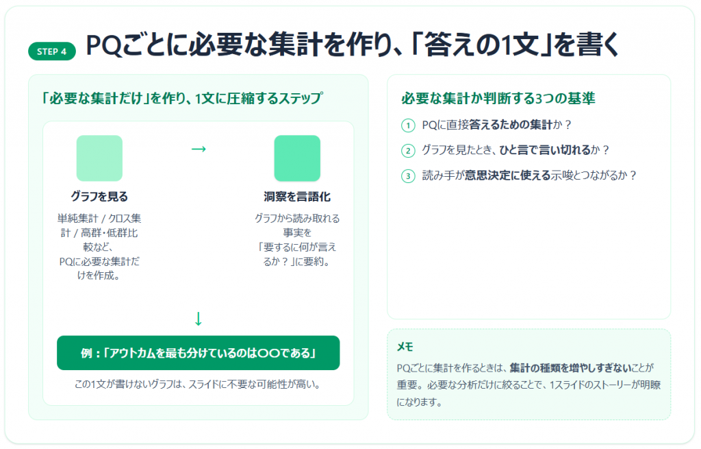 最後に、ここまでのPQ1、PQ2で得られた「答え」を統合し、意思決定者の背中を押す「示唆(アクション)」へと変換して、1枚のスライドにまとめます。