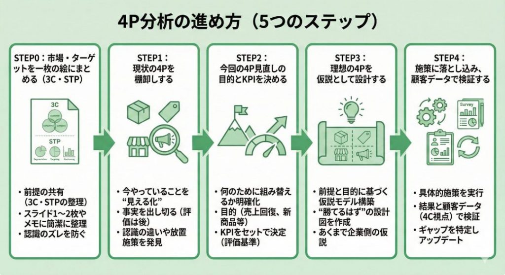 4P分析は、いきなり「価格はどうするか?」「広告はどうするか?」と個別の要素から考え始めると失敗します。全体の一貫性を保つために、正しい手順(プロセス)に沿って進めることが重要です。