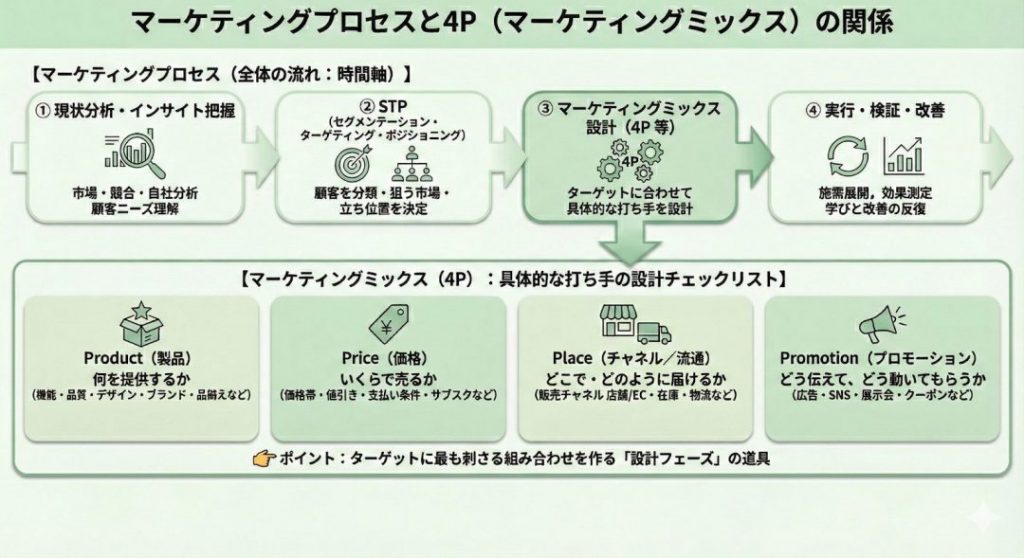 4Pだけを切り取って考えてしまうと、「とりあえず値下げする」「とりあえずSNSで発信する」といった場当たり的な発想になりがちです。本来、4Pは次のようなマーケティングプロセスの1ステップとして位置づけられます。