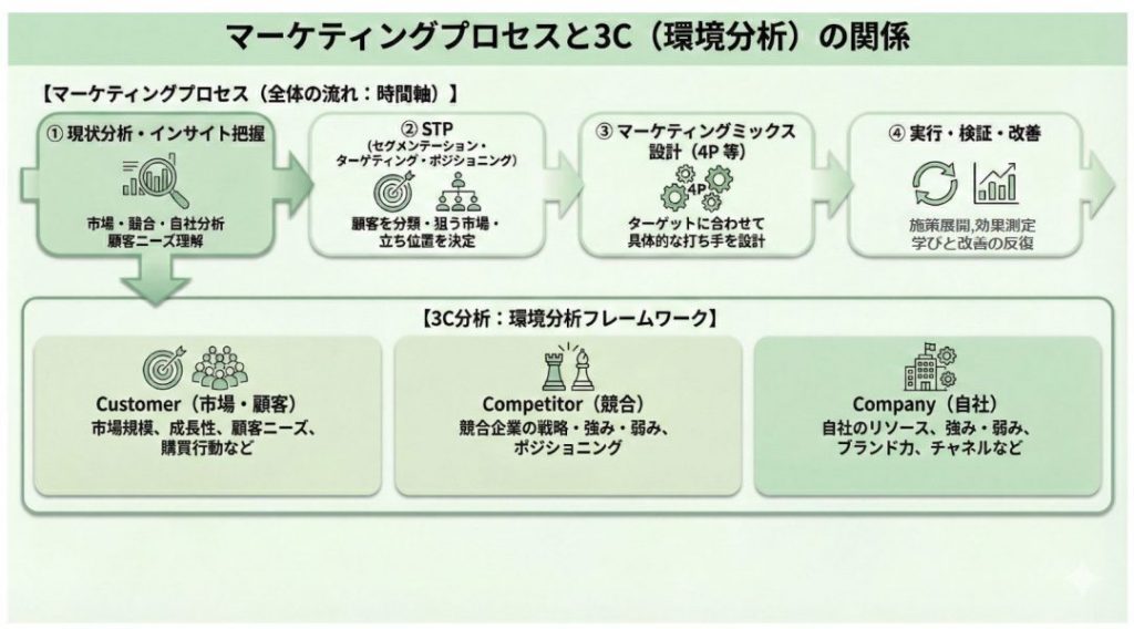 3C分析は、マーケティングプロセスの「環境分析」に位置づけられるフレームワークです。