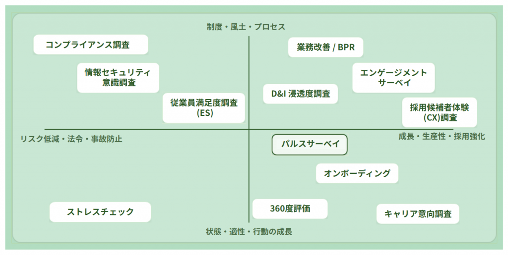 | パルスサーベイ | 組織状態のリアルタイムな定点観測 | 短い設問を頻繁(週次・月次)に行い、不調や変化を早期検知。 |